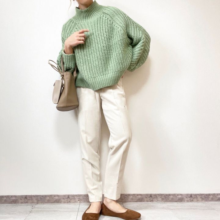 ざっくりオーバーサイズのニット合わせも文句無しに可愛いです。トップスにボリュームを置くだけで、より脚のラインをスッキリと細長く見せてくれます。