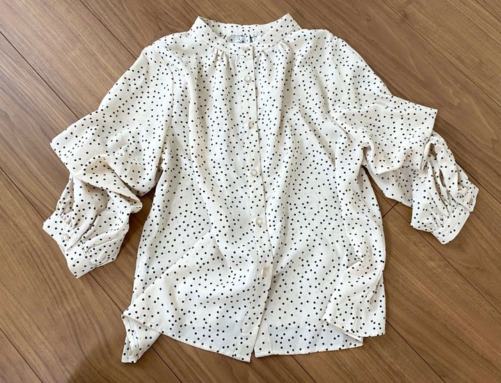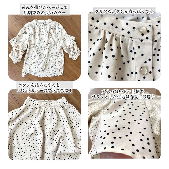 今回はマルチウェイで何通りもの着方が楽しめるお得感たっぷりの、春にぴったり1419円ドット柄ブラウスをご紹介します。