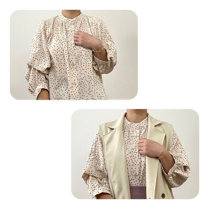 細かくランダムな配置のドット柄なので大人っぽく上品に着ることができ、サラッと肌触りの良い生地感でこれからの季節にぴったりのブラウスです。