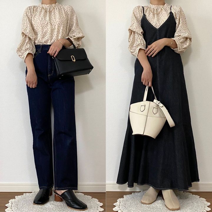 綺麗めな印象のブラウスですが、デニム素材と合わせてカジュアルダウンするのもおすすめなコーデです。