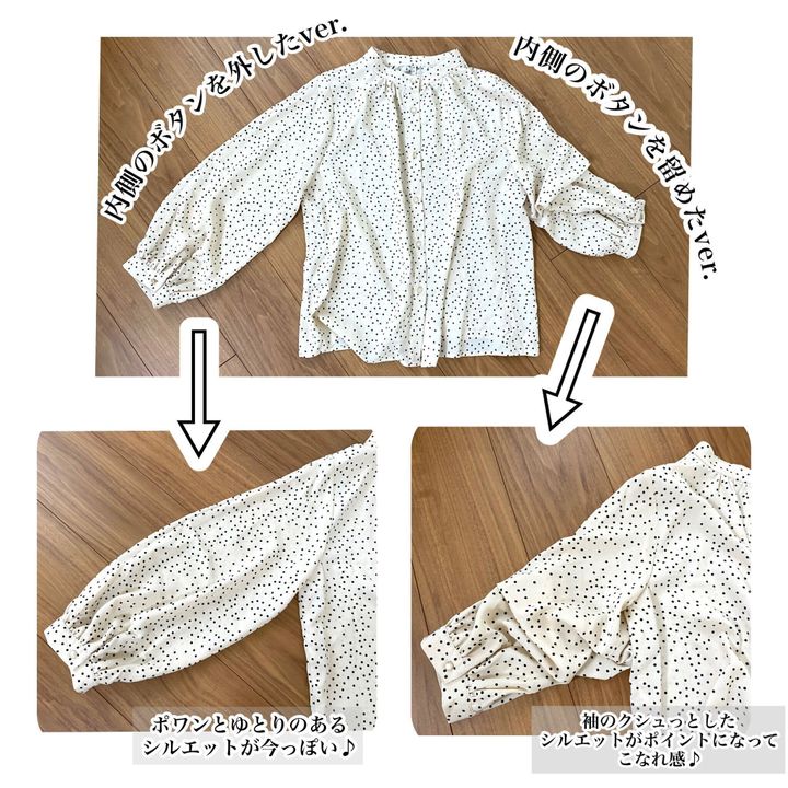 こちらのブラウスはさらに袖の内側に付いているボタンを留めたり外したりすることで、袖のデザインを変えることができます!