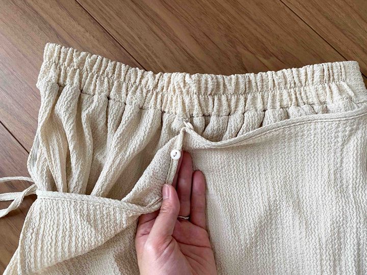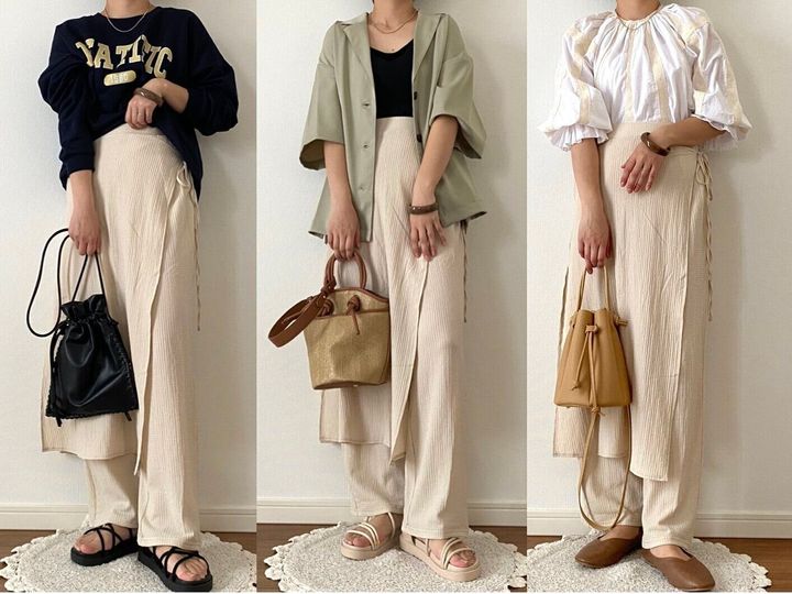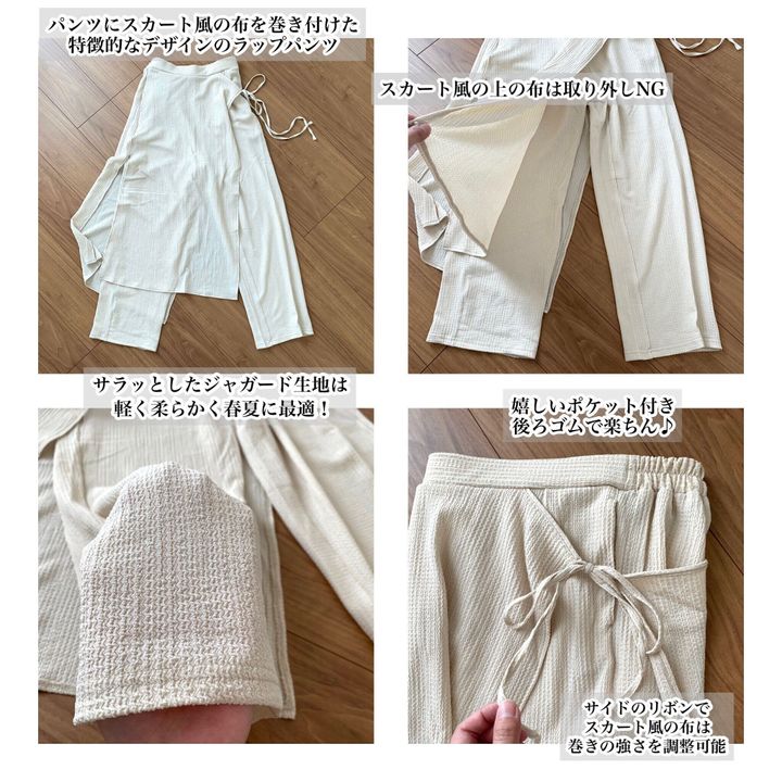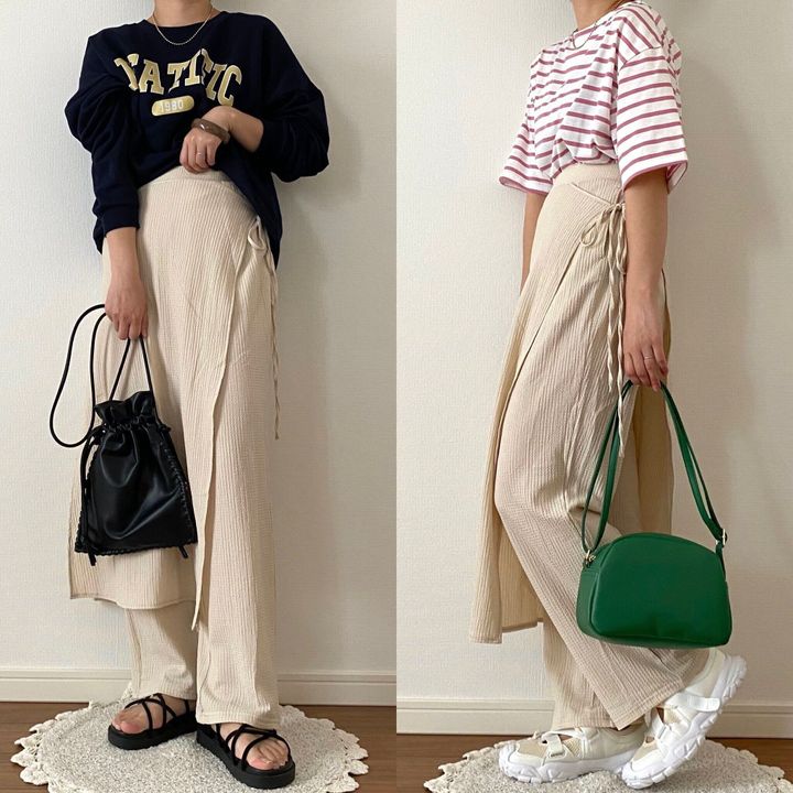 ボリューム感のあるブラウスを合わせてもスッキリとしたシルエットのラップパンツと相性が良さそう。淡色コーデにも最適ですね!