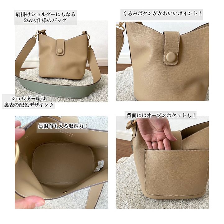 配色のショルダー紐は取り外し可能なのでシンプルなベージュのバッグとしても活躍します。
