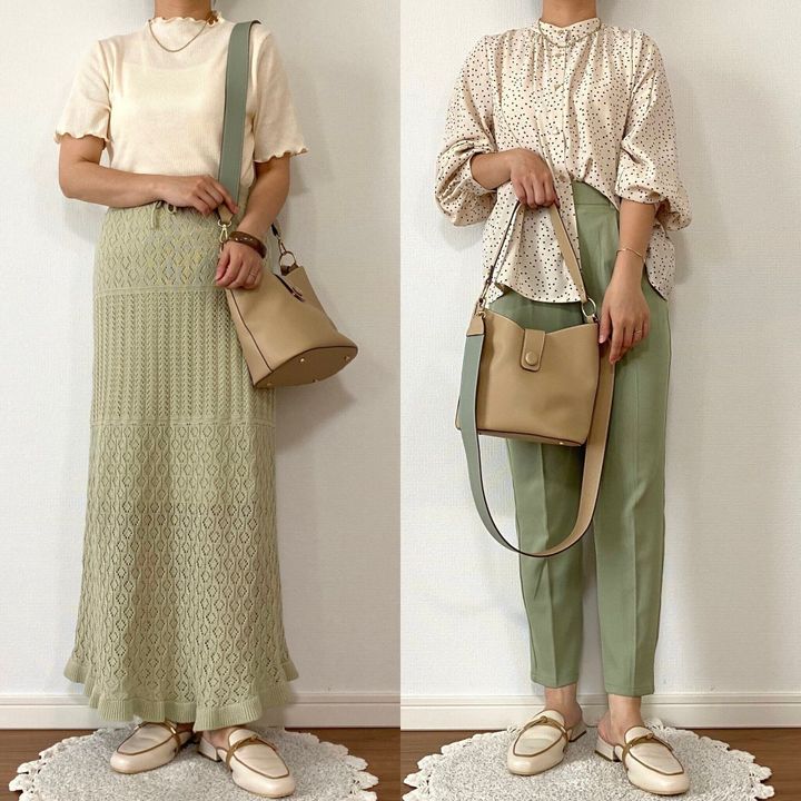 バッグの配色に合わせてグリーンとベージュでまとめた柔らかい印象の淡色コーデです。