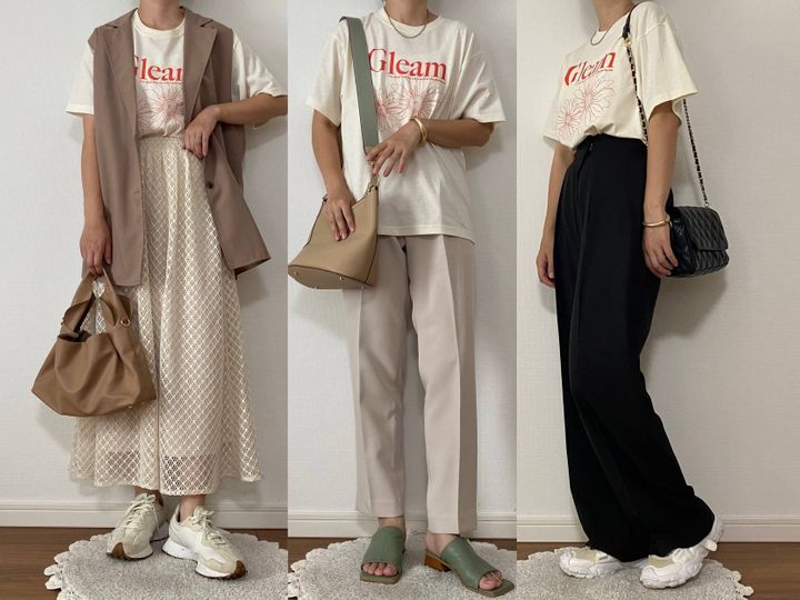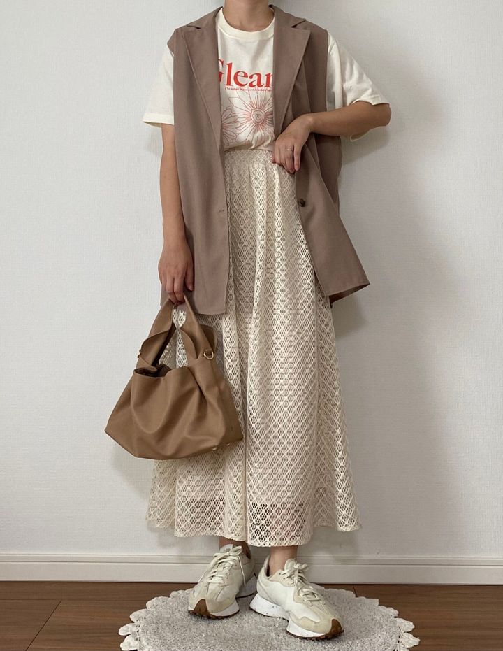 ジレやベストなどトレンドアイテムを重ねてもロゴやお花に存在感がありコーデのポイントになってくれます。