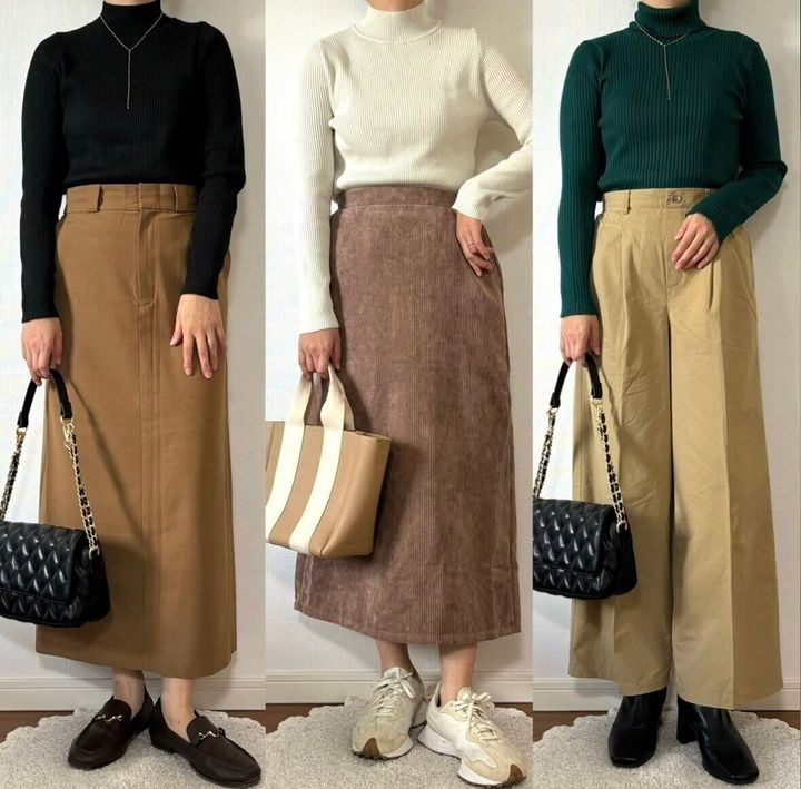 どちらのニットも細いリブで縦ラインが強調され全体をスッキリと見せてくれます。