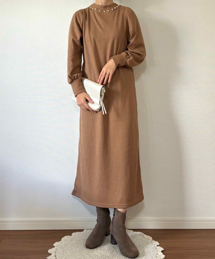 広がりすぎないシルエットですっきり見えるのに裏起毛で暖かいワンピースです。