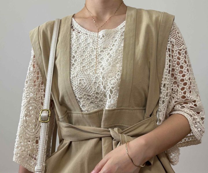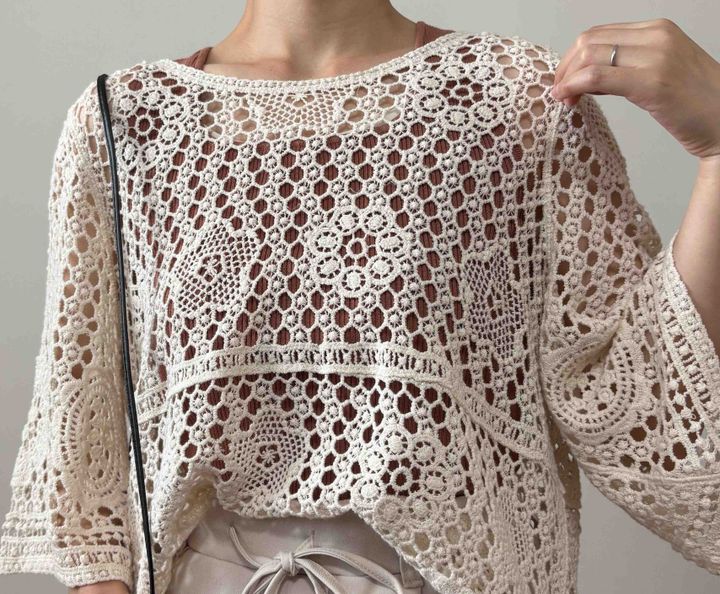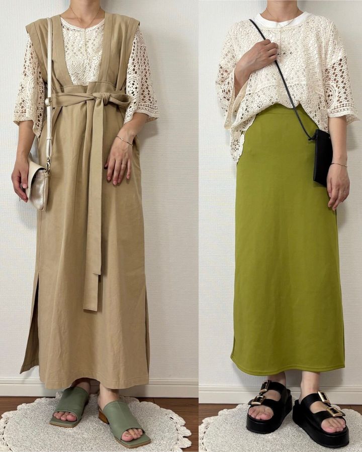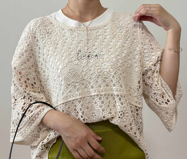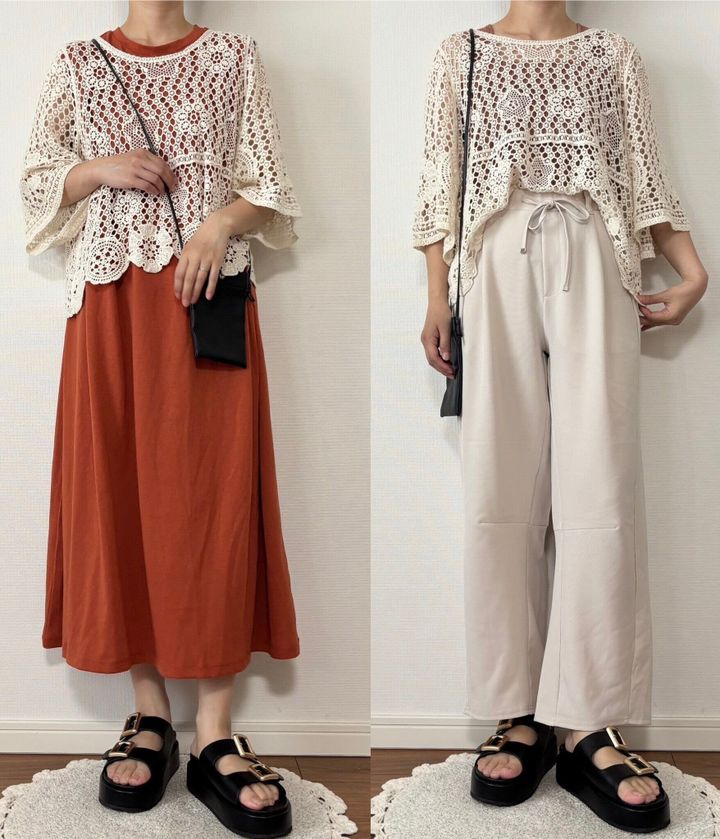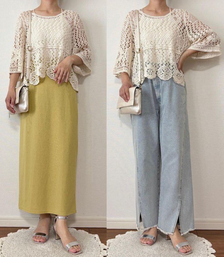 それでもこのお花レースのデザインと編み目からのぞく素肌がアラフォーには厳しいのでは?と抵抗感のある方におすすめのコーディネートがこちら!