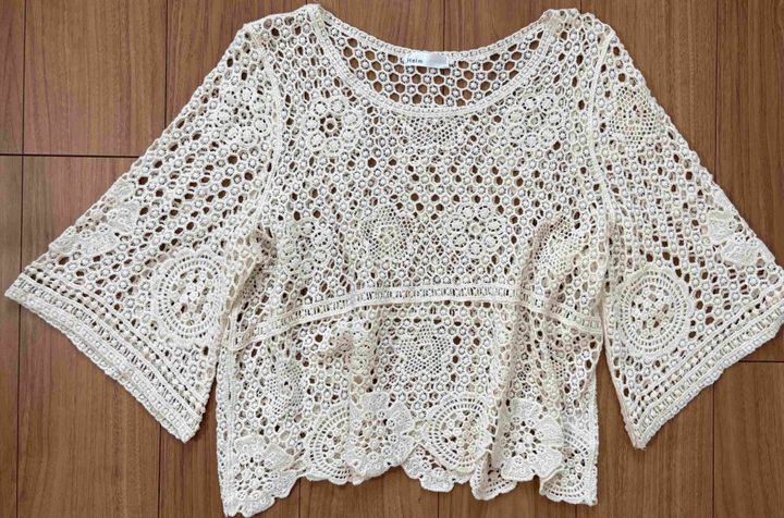 ざっくりとした編み目にさまざまな形のレース編みデザインが施されています。