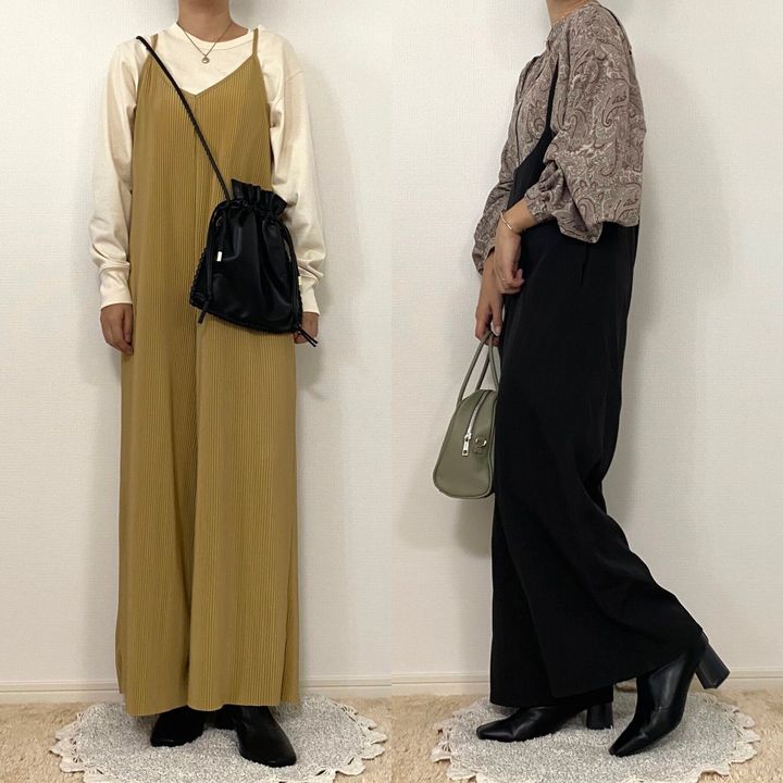 夏はサンダルと合わせたこちらのサロペットも、足元をブーツするだけで一気に秋冬仕様になります。