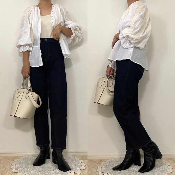 デニムもストレートシルエットのものと合わせると、ブーツの足首の細さが際立ってよりスタイリッシュに見えますね。