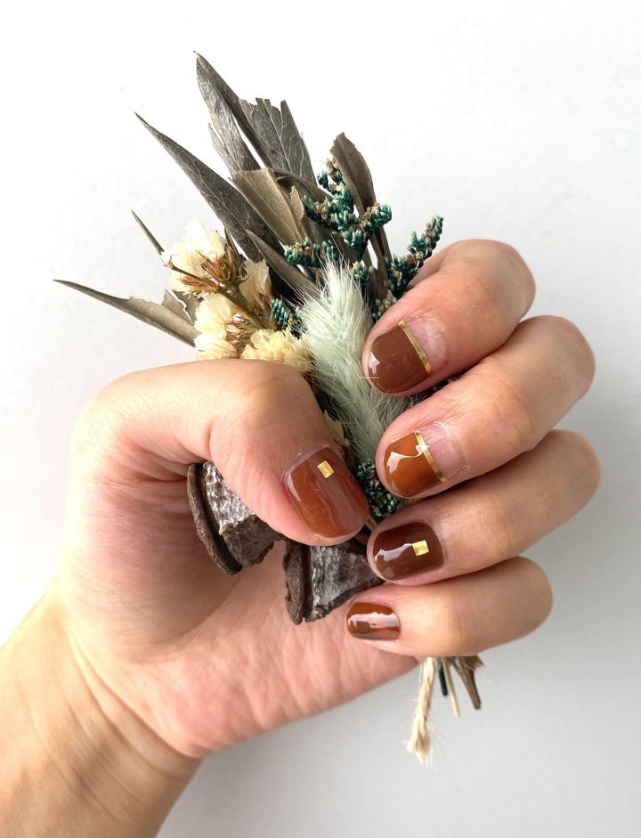 明るさだけ変えた加工なしの仕上がりがこちらです!上に塗ったトップコートもしっかり硬化され、ツヤツヤした爪に気分が上がります!