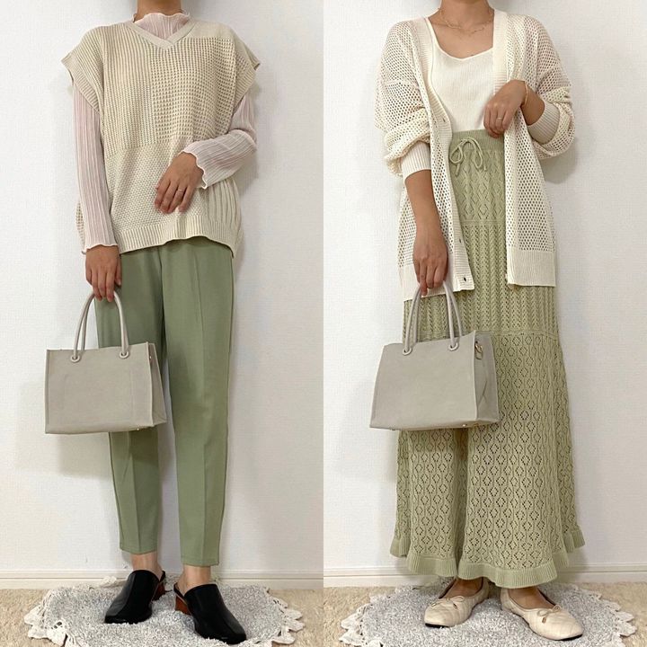 トレンドの淡いグリーンと合わせて淡色コーデ