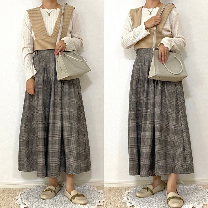グレンチェックのスカーチョとバッグのスエード素材で季節感のある大人の秋冬コーデの完成。