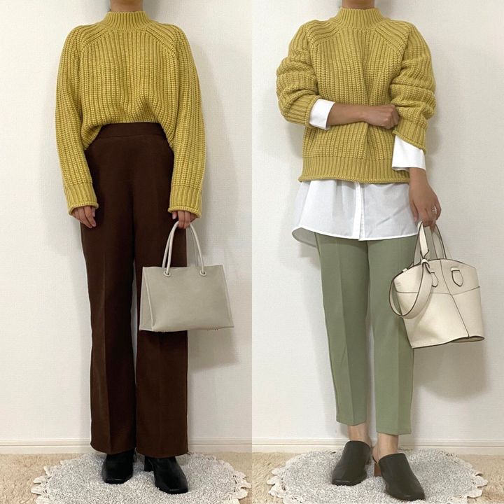 ニットがイエローですが優しい色合いなので他のカラーとも合わせやすいです。