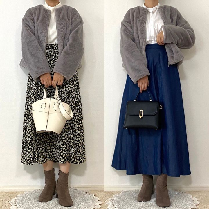 ファージャケットのフェミニンさを引き立てるスカートコーデはお出かけやデートにぴったりですね!