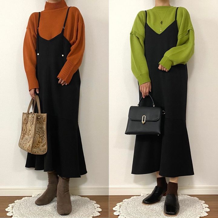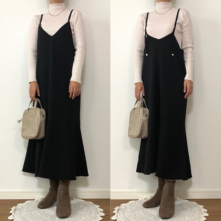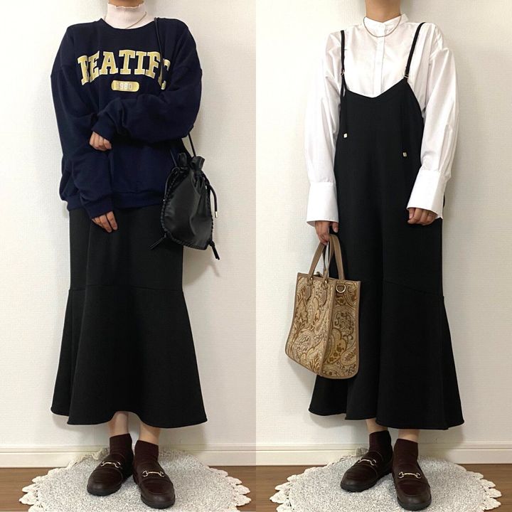 ジャンパースカートの上からトップスを着てしまえば、左のコーデのようにスカートとしても着回し可能!