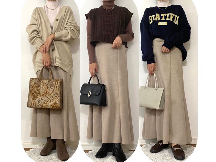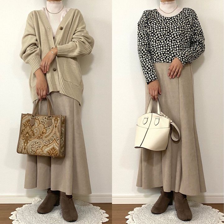 スエード調の生地に季節感があり、落ち着いたベージュなのでどんなアイテムとも合わせやすそうです!