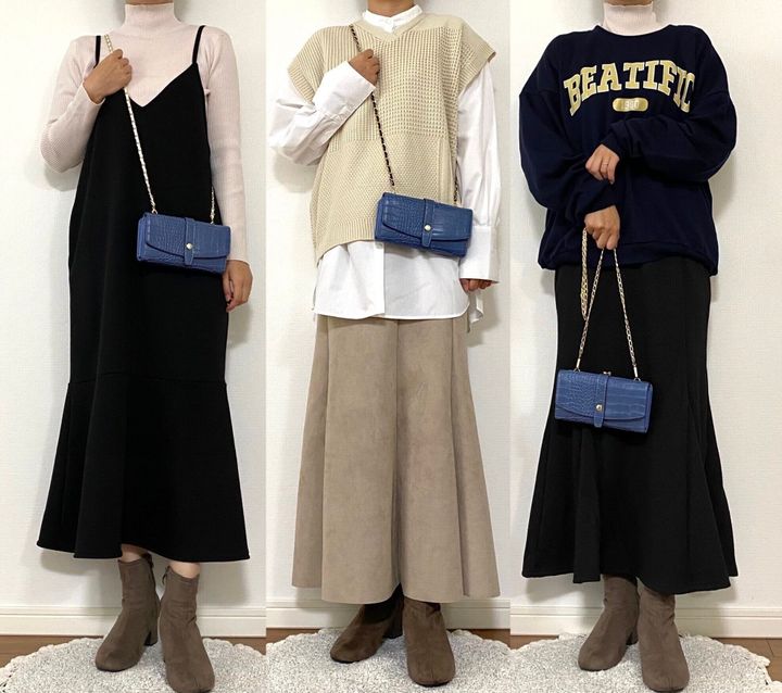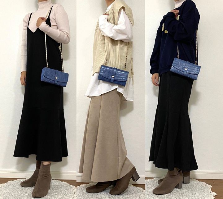 ブラックのジャンスカや淡色コーデの差し色に。チェーンが大人っぽく綺麗目なのでスウェットコーデの外しに使うのもいいですね。