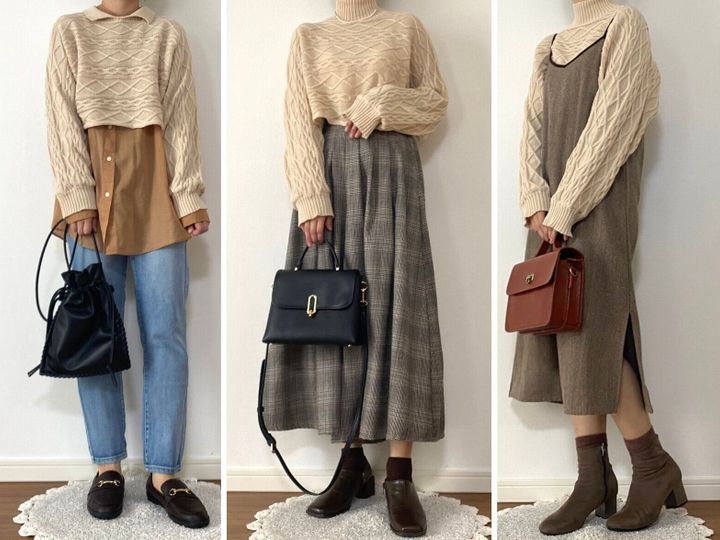 ニットONニットのコーデでインナーはそれぞれホワイトとブラウンのニットをイン!