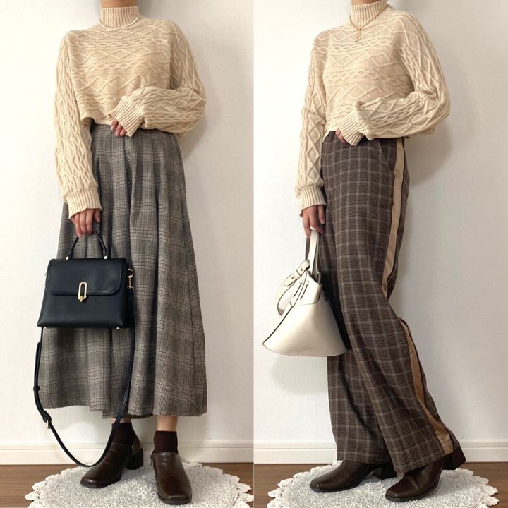 右は襟付きニット側のインナーにハイネックをレイヤードしてマーメイドスカートと。