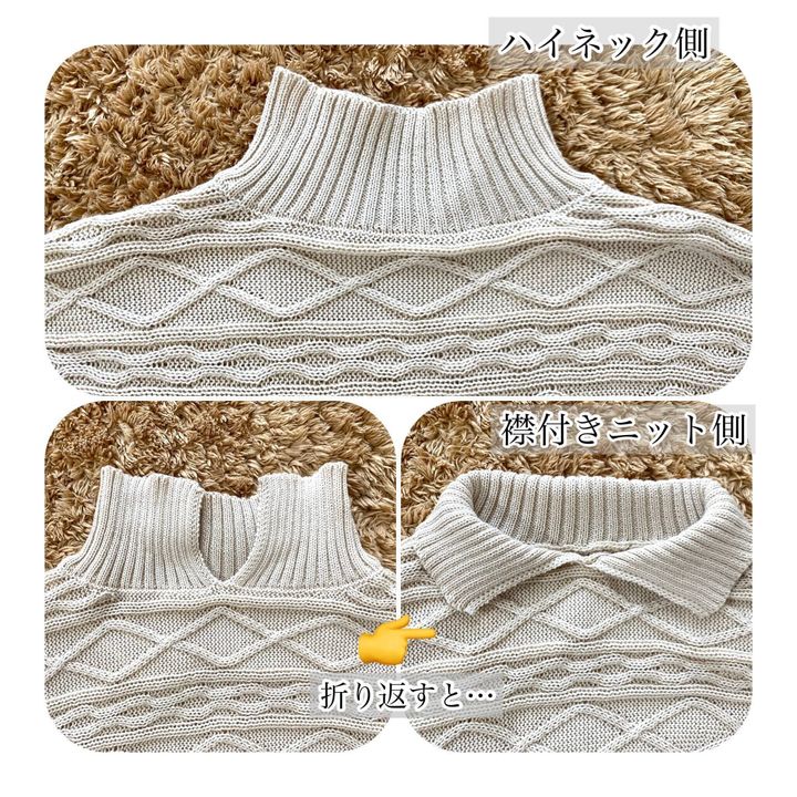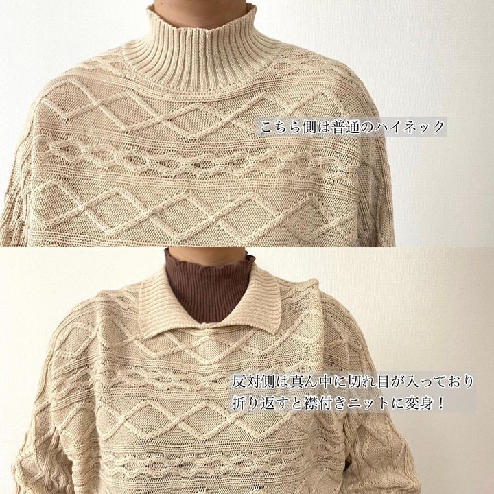 一方は普通のハイネックデザインとして着ることができ、反対側は真ん中の切れ目を折り返すと襟付きニットへと早変わり!