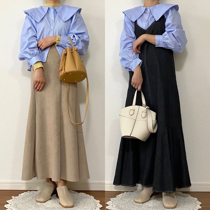 しかし、こちらのビッグカラーブラウスは丸襟ではなく襟先が尖ったデザインで大人っぽい印象なのでコーデにも取り入れやすそうです。