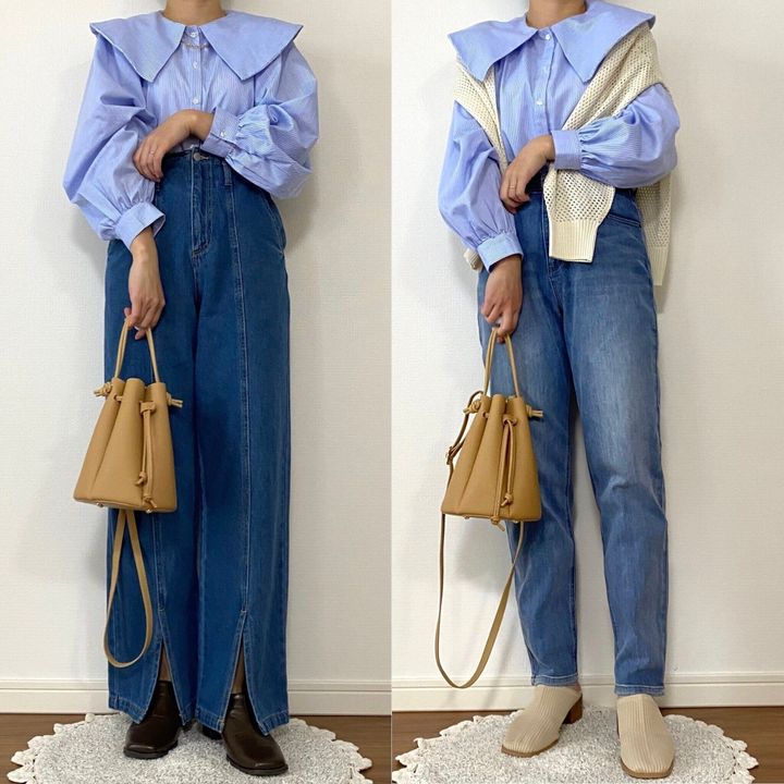ビッグカラーが可愛らしい印象なのでデニムと合わせてカジュアルダウンするのも◎