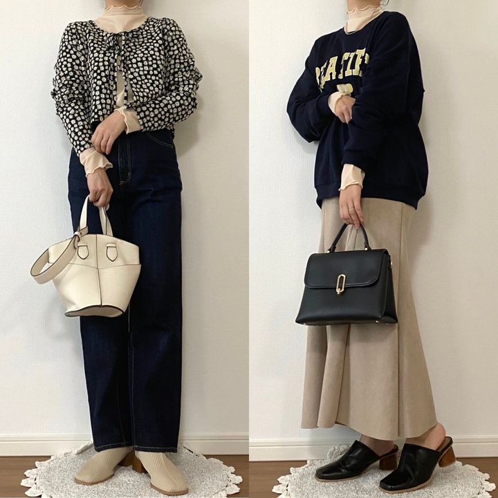 左は花柄カーディガンの中に着て綺麗目なコーデに。