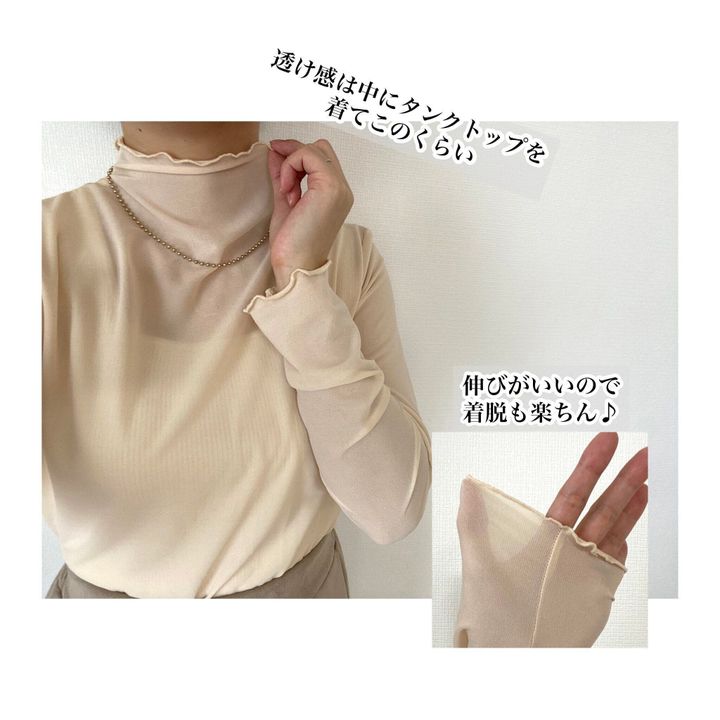 秋冬はニットONニットやプルオーバーのハイネックをレイヤードしていましたが、春夏に向けてシアーのハイネックがあれば活躍の機会が増えそう。