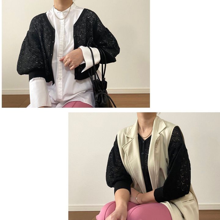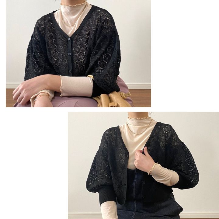 ブラックですが透かし編みのおかげでレイヤードしても重たい印象になりません。