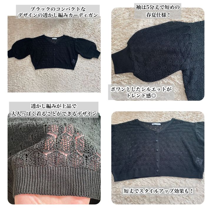 今回はこれからの季節に大活躍しそうな透かし編みで、シルエットがとってもかわいい1419円のカーディガンをご紹介します。