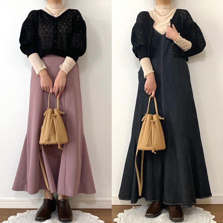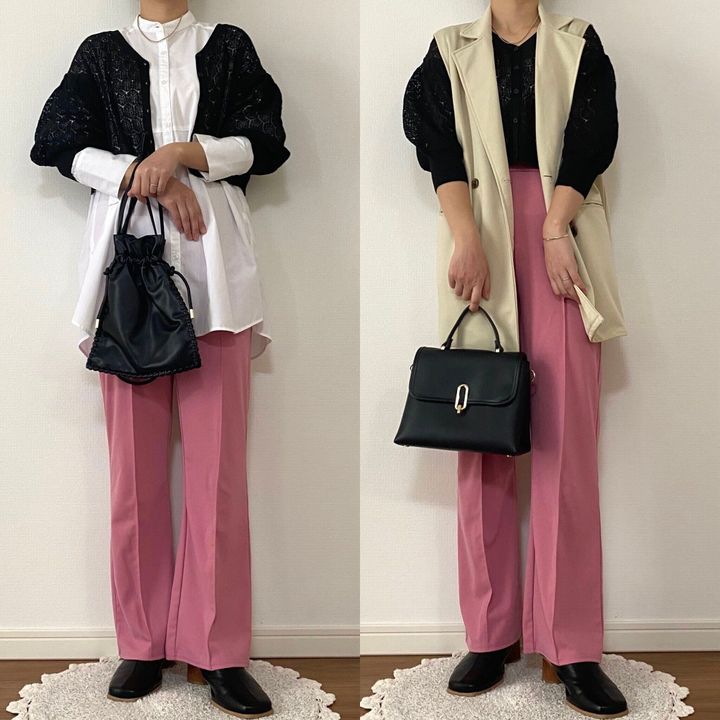ブラックなのでカラー物のシアートップスを重ねるのもかわいいですね。