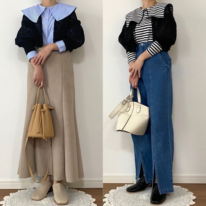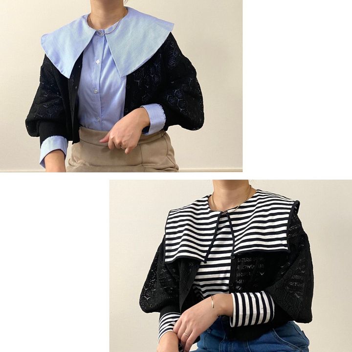 羽織ったカーディガンの上からビッグカラーを覗かせるスタイルにも!