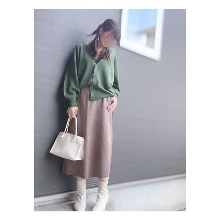 スエード素材のナロースカートと合わせて、大人スタイル。