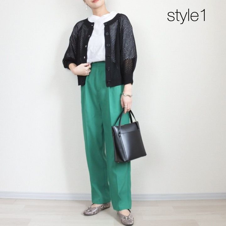 ブラックのメッシュニットカーディガンがカラーボトムスの派手さを抑えつつ、しっかりと旬なスタイリングに仕上げてくれます。