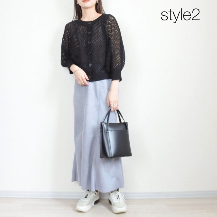 春らしい淡い色味のマーメイドスカートと合わせた春らしいスタイリングです。