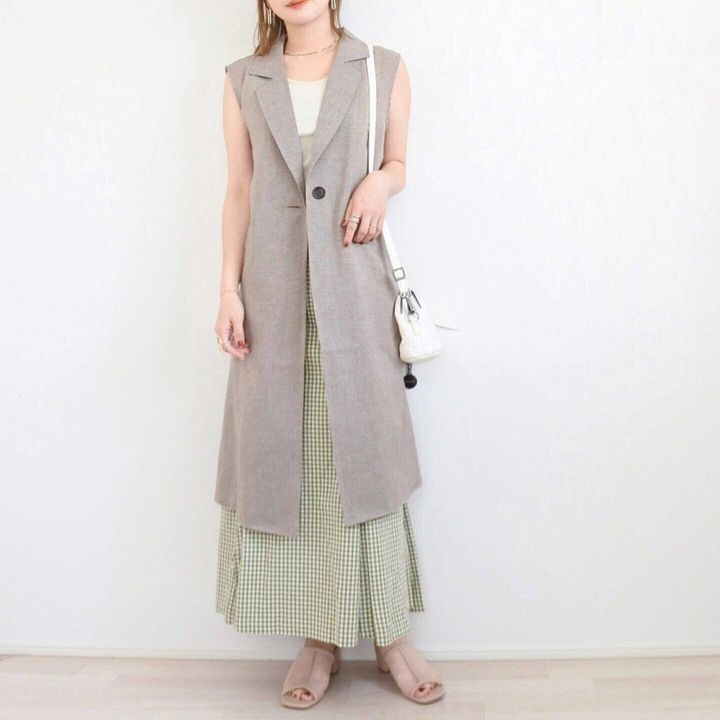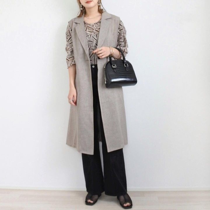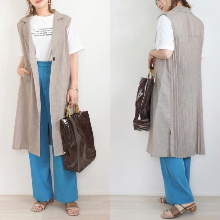 リネンのような風合いのある生地とバックプリーツデザインが高見えするジレ♪