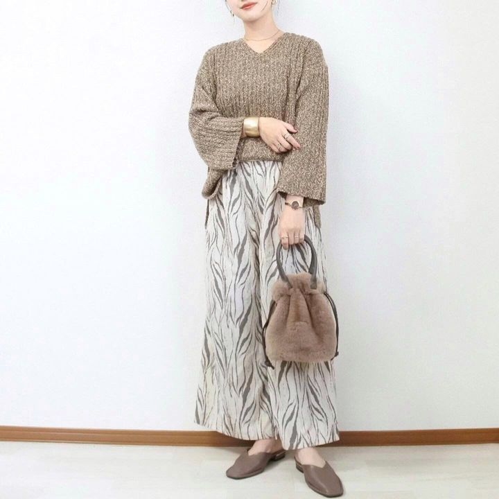 表情のあるニットには今年らしく柄パンツとの合わせがおすすめです。