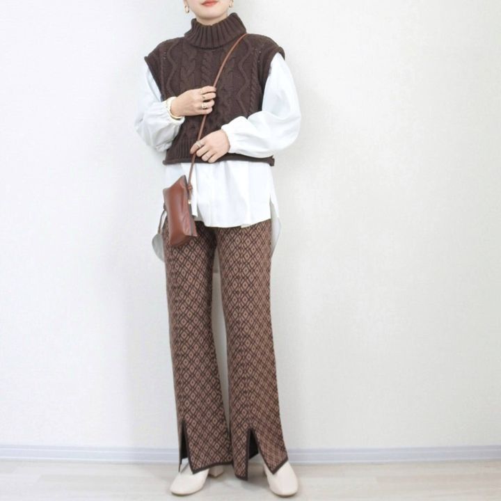 ボトムスには今年らしいジャガード柄ニットパンツや柄物を組み合わせて