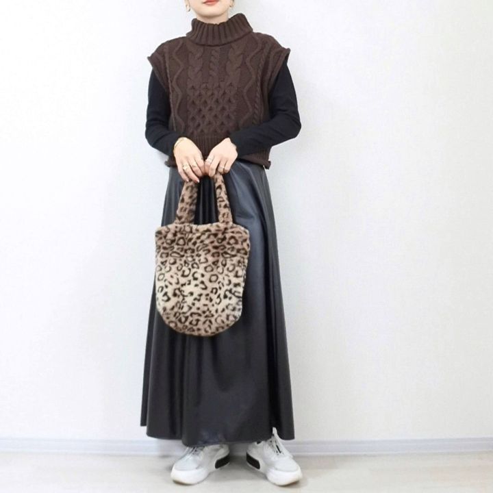 トップスと同色のレザースカートを合わせてシックなコーディネートに◎