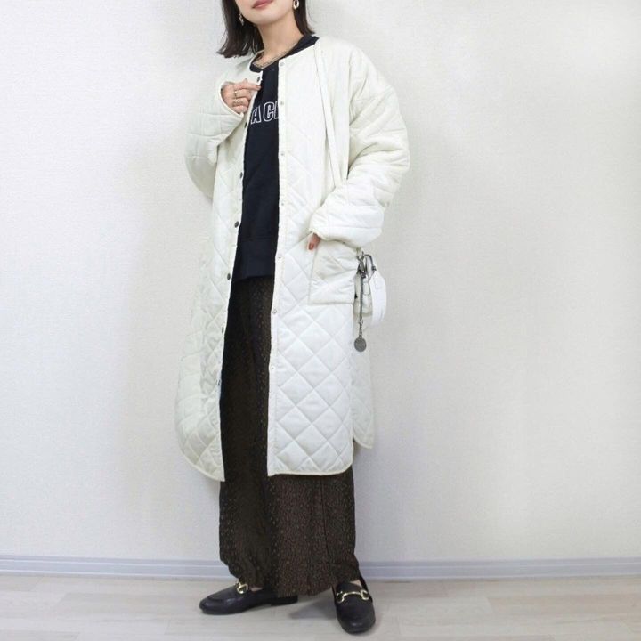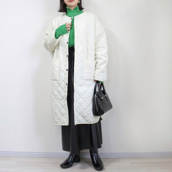 中をダークトーンにまとめて大人な配色にするとよりキルティングコートのパキッとしたホワイトが映えます◎