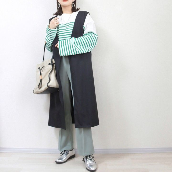 くすみグリーンに合わせてトップスもグリーン系のボーダーを合わせた春コーデ。