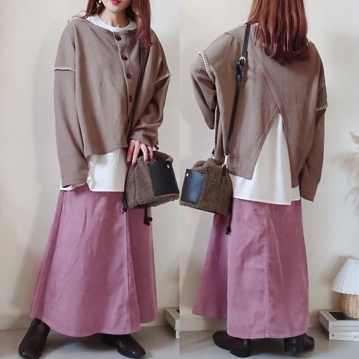 こちらはピンクのコーデュロイ生地のスカートでコーデしてみました。カーディガンのカラーがニュアンスカラーなので、これぐらいのピンクでコーデしても可愛いと思います。インナーにタンクトップをレイヤードしています。