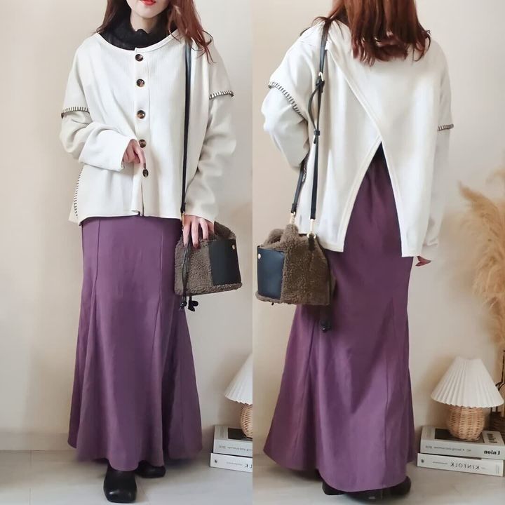 私はパープルのマーメイドスカートで合わせてみました。インナーには黒のタートルネックのトップスを着ています。