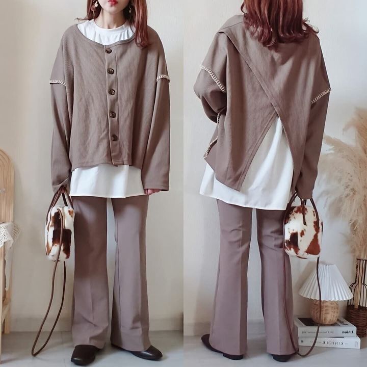 こちらのカラー表記は淡緑となっていますが、画像でご覧の通りブラウンっぽいんです。近いカラーのブラウンのパンツとタンクトップのレイヤードコーデです。