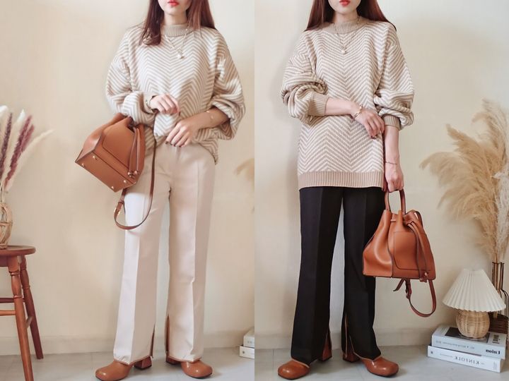 左はベージュのパンツで淡色コーデ、右はブラックでシンプルコーデ。