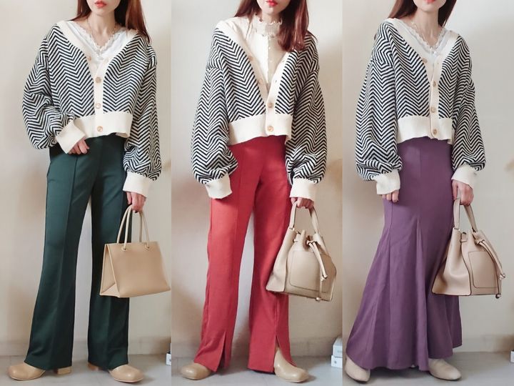 こちらのブラック系ヘリンボーン柄のショート丈カーデには今期らしくカラーものとコーデしてみました。小物アイテムはブラックでまとめるよりベージュの方がハードにならず、大人っぽくなると思います。