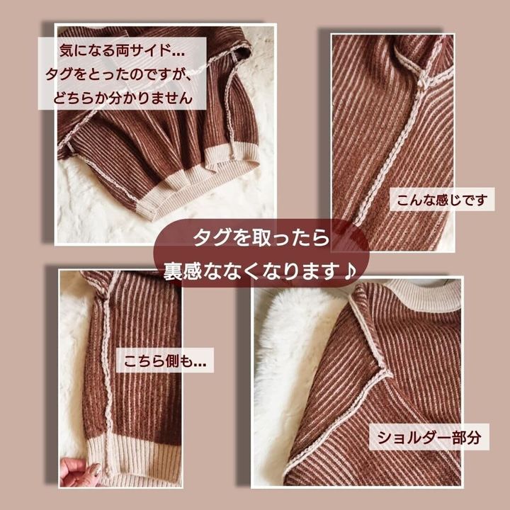 取ったあとはどこにタグがあったかなんてわかりません。タグさえなくなればこれがまさかの裏面だとは誰も気づかないでしょう。ちょうどこの縫い合わせ部分が今季トレンドの配色ニットのように見えますよね。なるほど!これはまさにリバーシブルデザインだと思います。