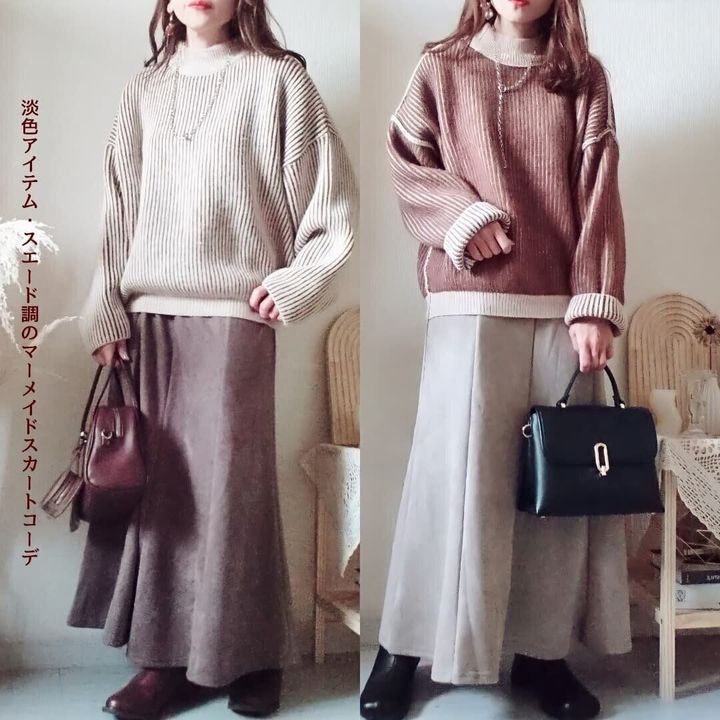 スエード調の素材のマーメイドスカートとコーデしてみました。淡色同士てものっぺりにならないように異素材の組み合わせで奥行き感を出しています。